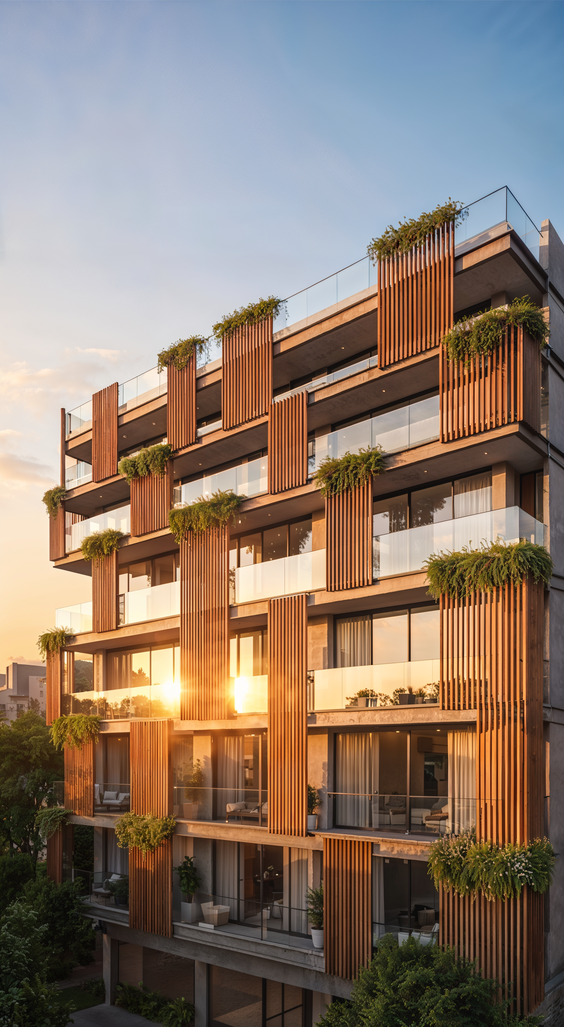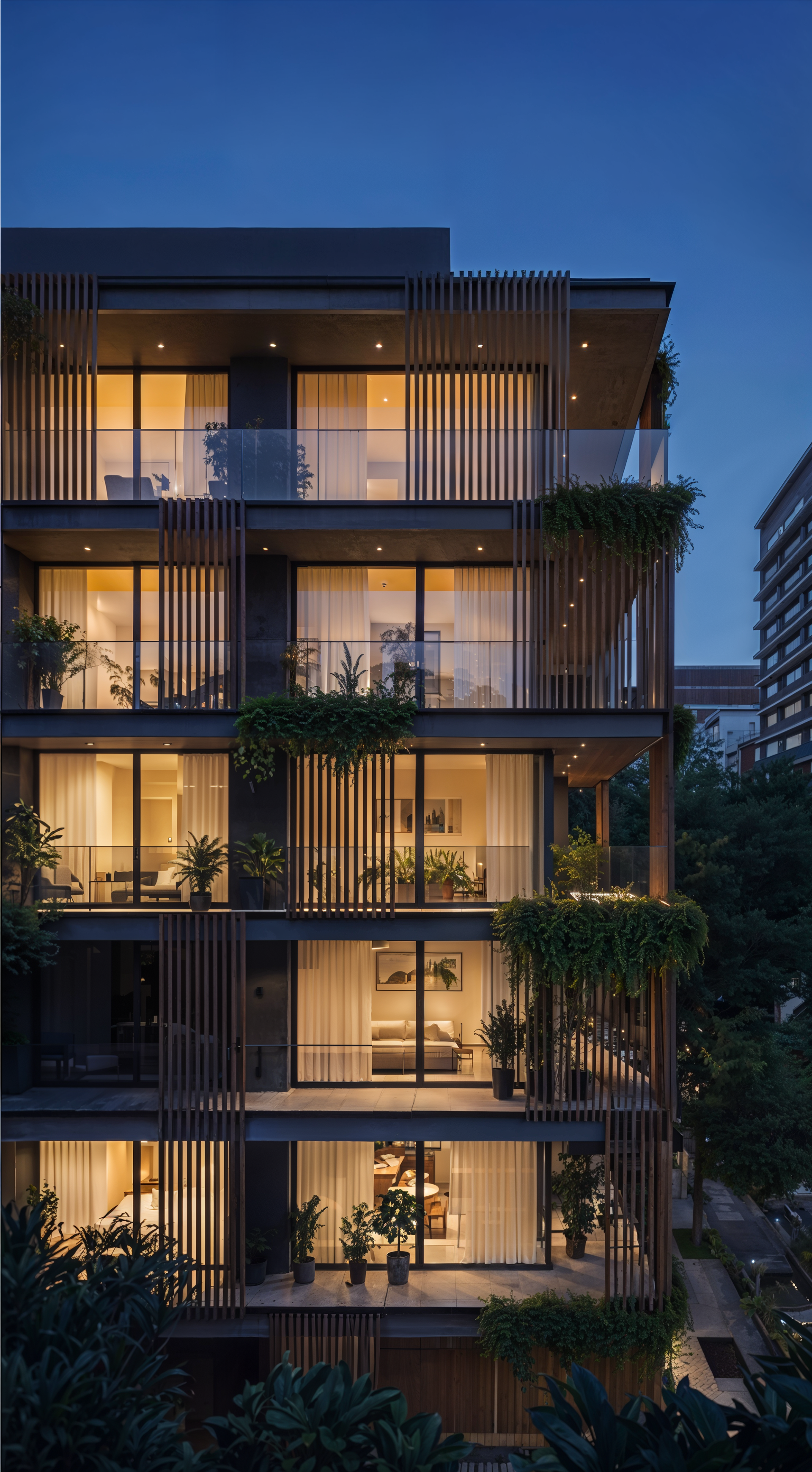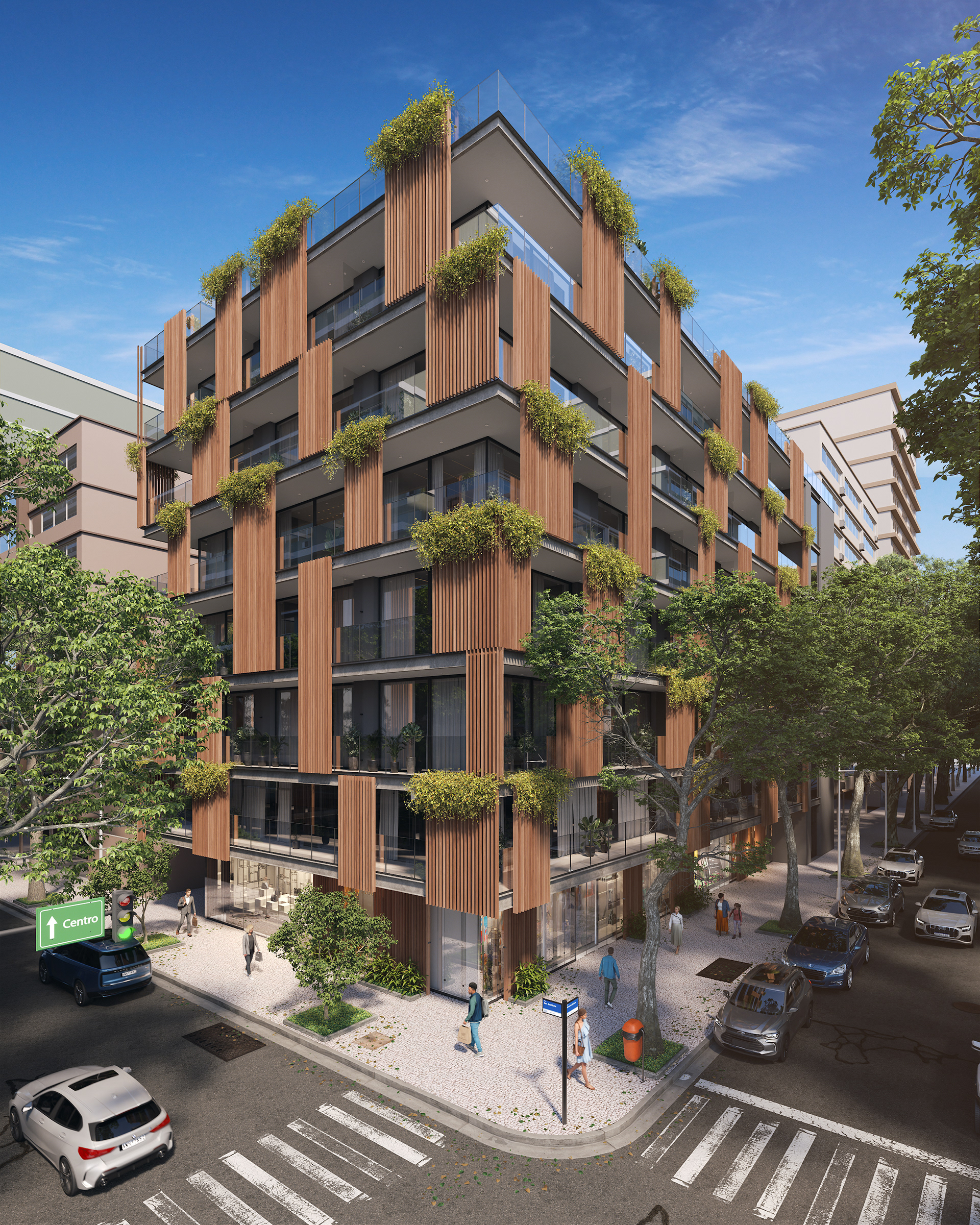 Nossa proposta foi traduzir, com fotorrealismo, um design que equilibra linhas contemporâneas e a integração de elementos naturais. Através da renderização, destacamos os painéis ripados em madeira, a vegetação exuberante nas varandas e a riqueza de detalhes que criam uma atmosfera sofisticada e acolhedora.