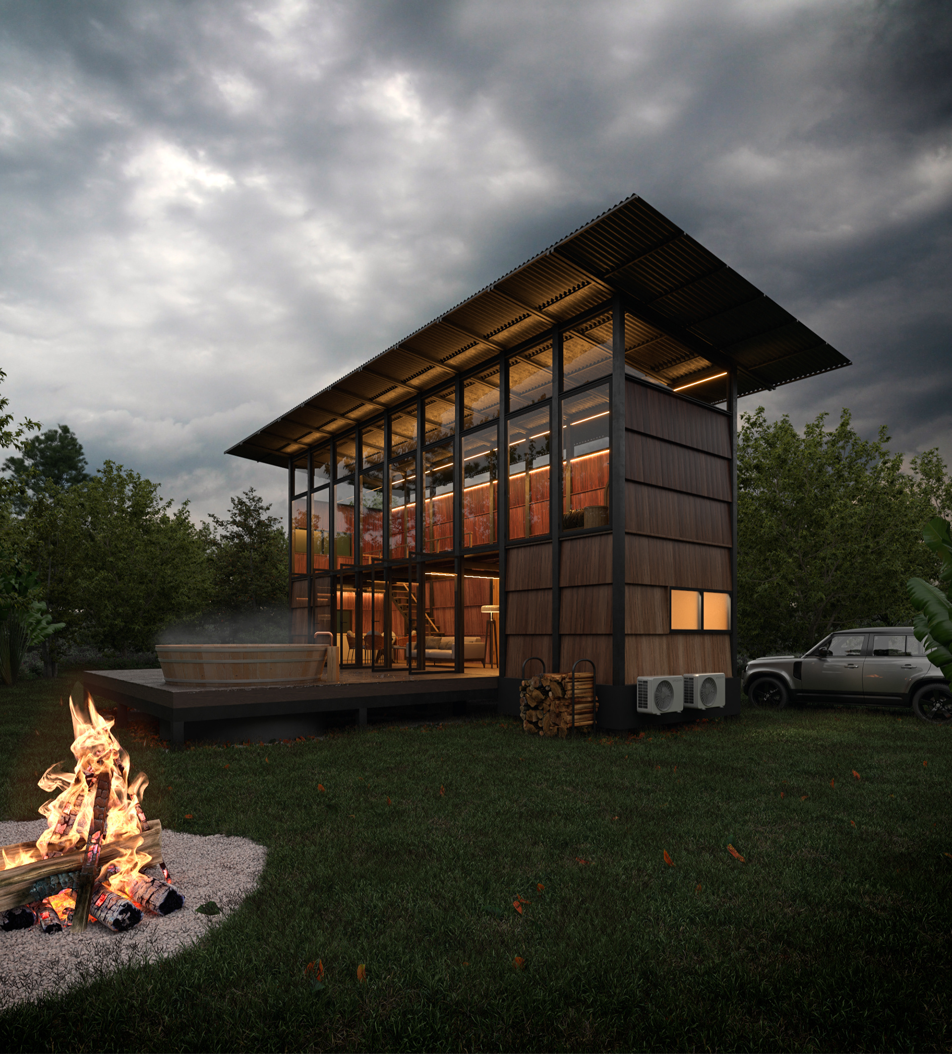 O tempo nublado (Overcast) foi o cenário perfeito para destacar o calor humano do projeto. A transparência da fachada de vidro dissolve as barreiras entre o interior e o exterior, enquanto a fogueira e a iluminação em tons de âmbar transformam a cabana em um farol de conforto no meio da floresta.