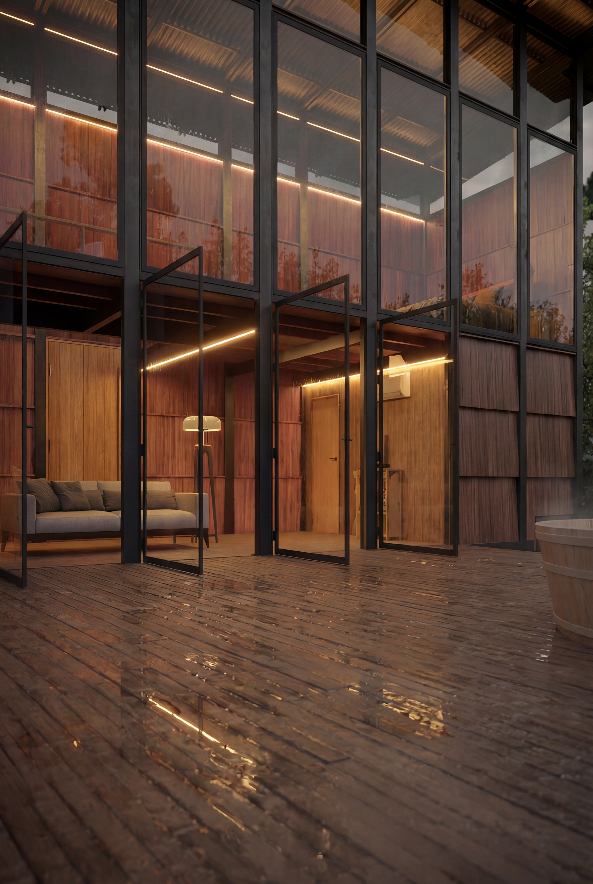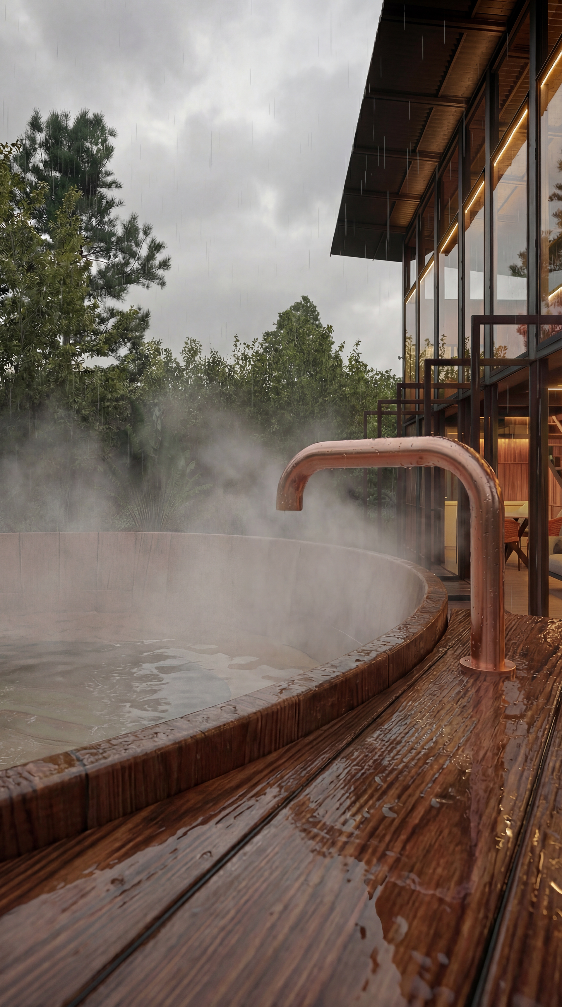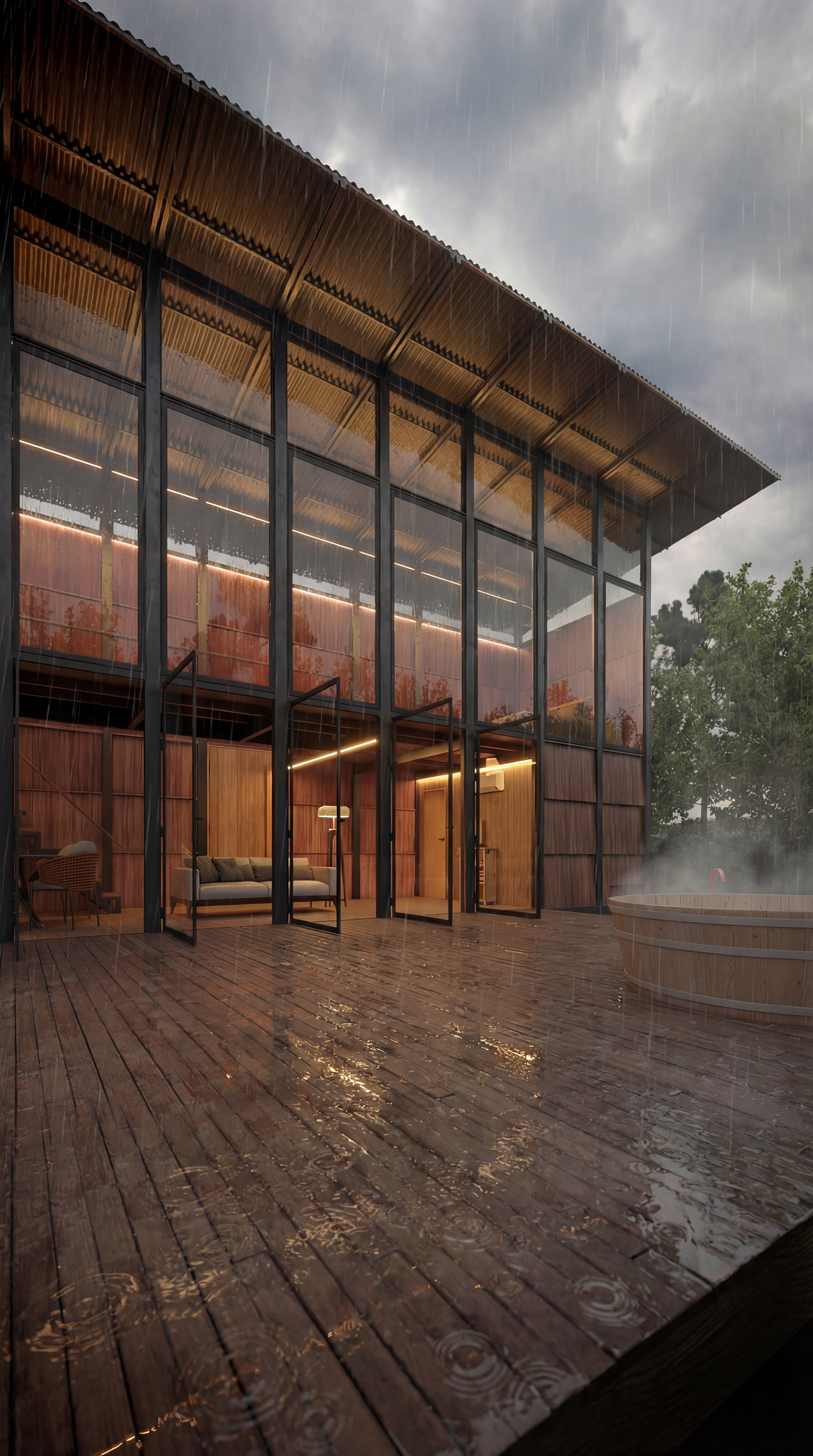 Para atestar o hiper-realismo das texturas, submetemos a cena à chuva. A água revela o brilho da madeira tratada, o peso do metal e a beleza crua dos materiais. Cada gota no deck e cada reflexo na torneira de cobre foram renderizados para transmitir a sensação tátil e o som do clima, trazendo o espectador para dentro da cena.
