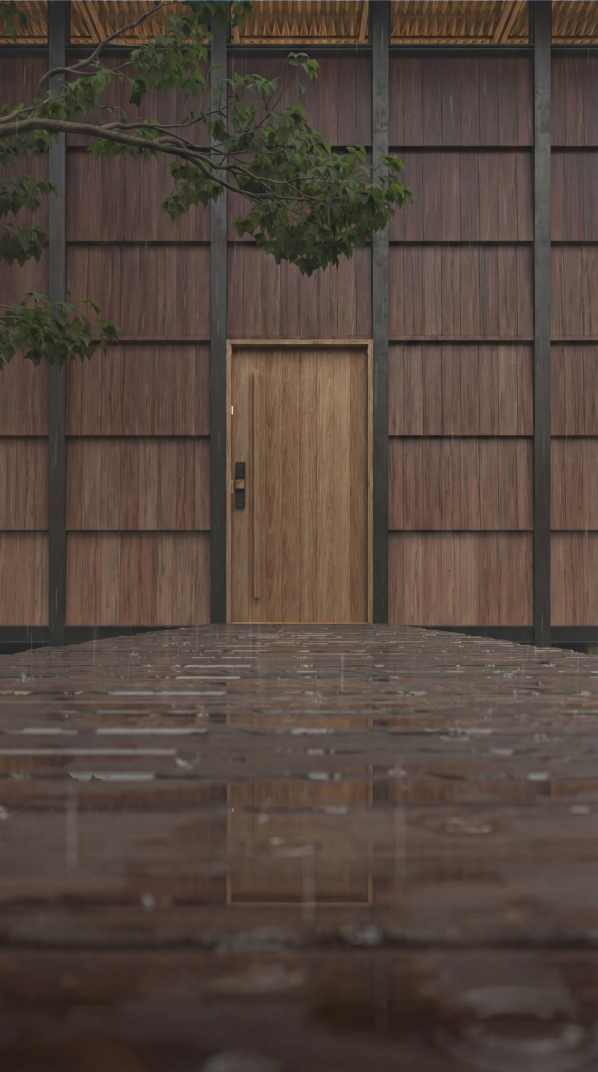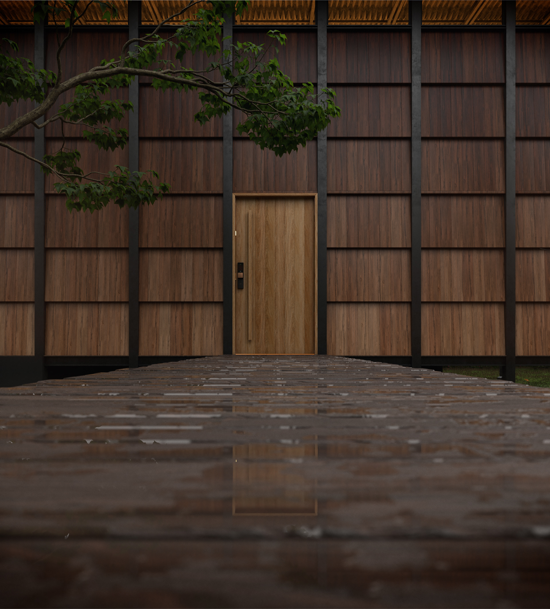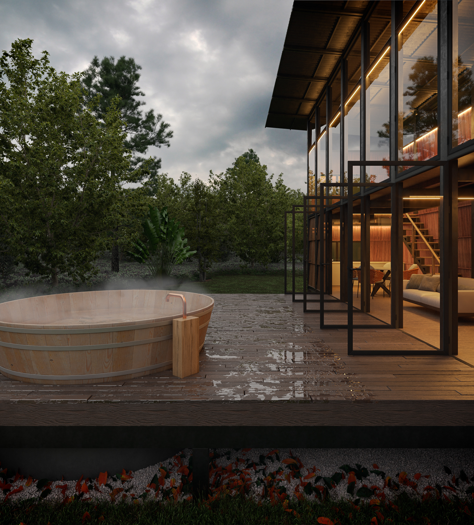 Para atestar o hiper-realismo das texturas, submetemos a cena à chuva. A água revela o brilho da madeira tratada, o peso do metal e a beleza crua dos materiais. Cada gota no deck e cada reflexo na torneira de cobre foram renderizados para transmitir a sensação tátil e o som do clima, trazendo o espectador para dentro da cena.