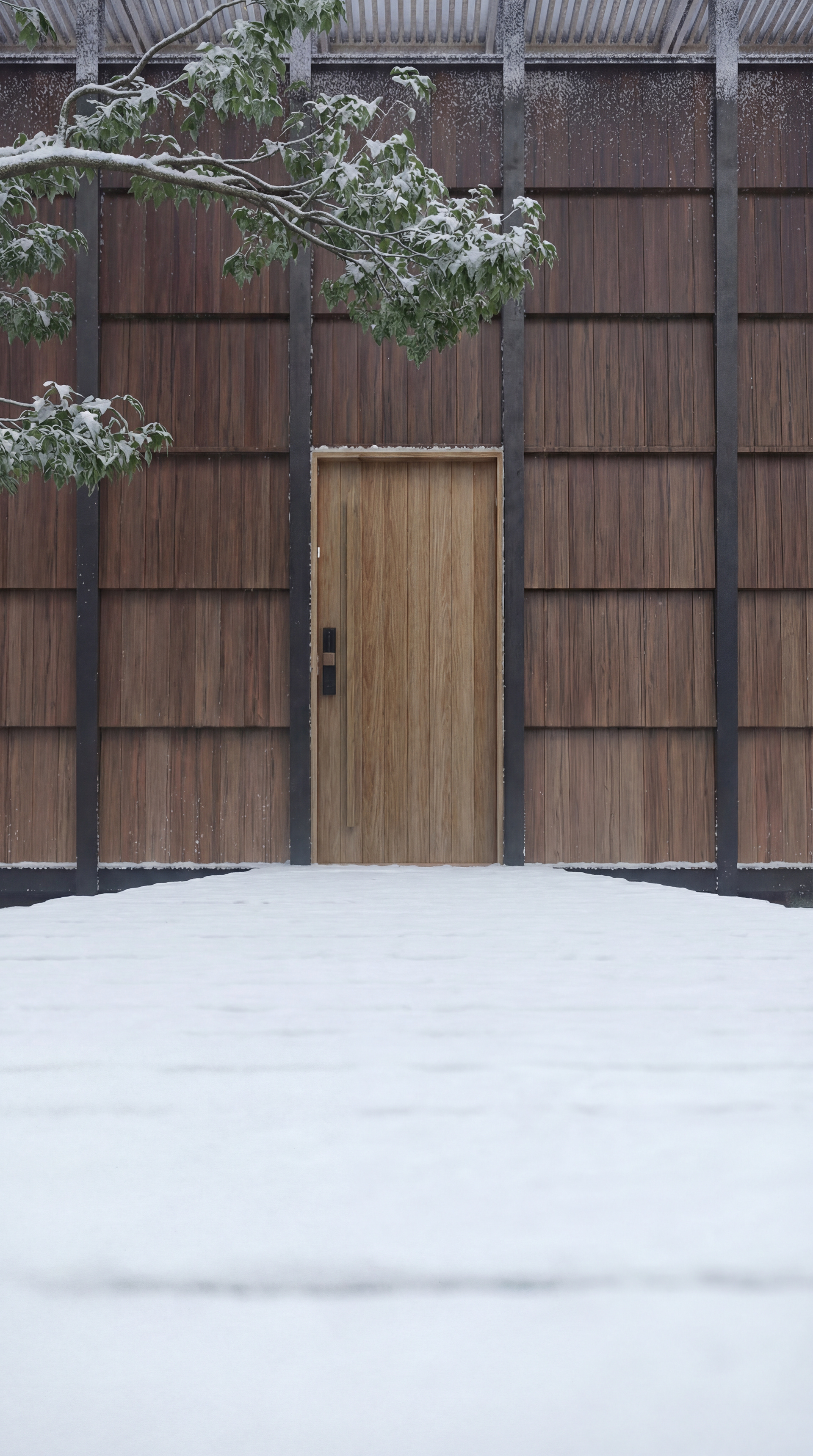 A arquitetura de alto padrão deve resistir e se adaptar. Na variação de inverno, a neve altera completamente a leitura volumétrica da cabana. A paleta de cores frias e o isolamento visual provam a versatilidade do projeto, mantendo a imponência da estrutura mesmo sob as condições mais extremas.