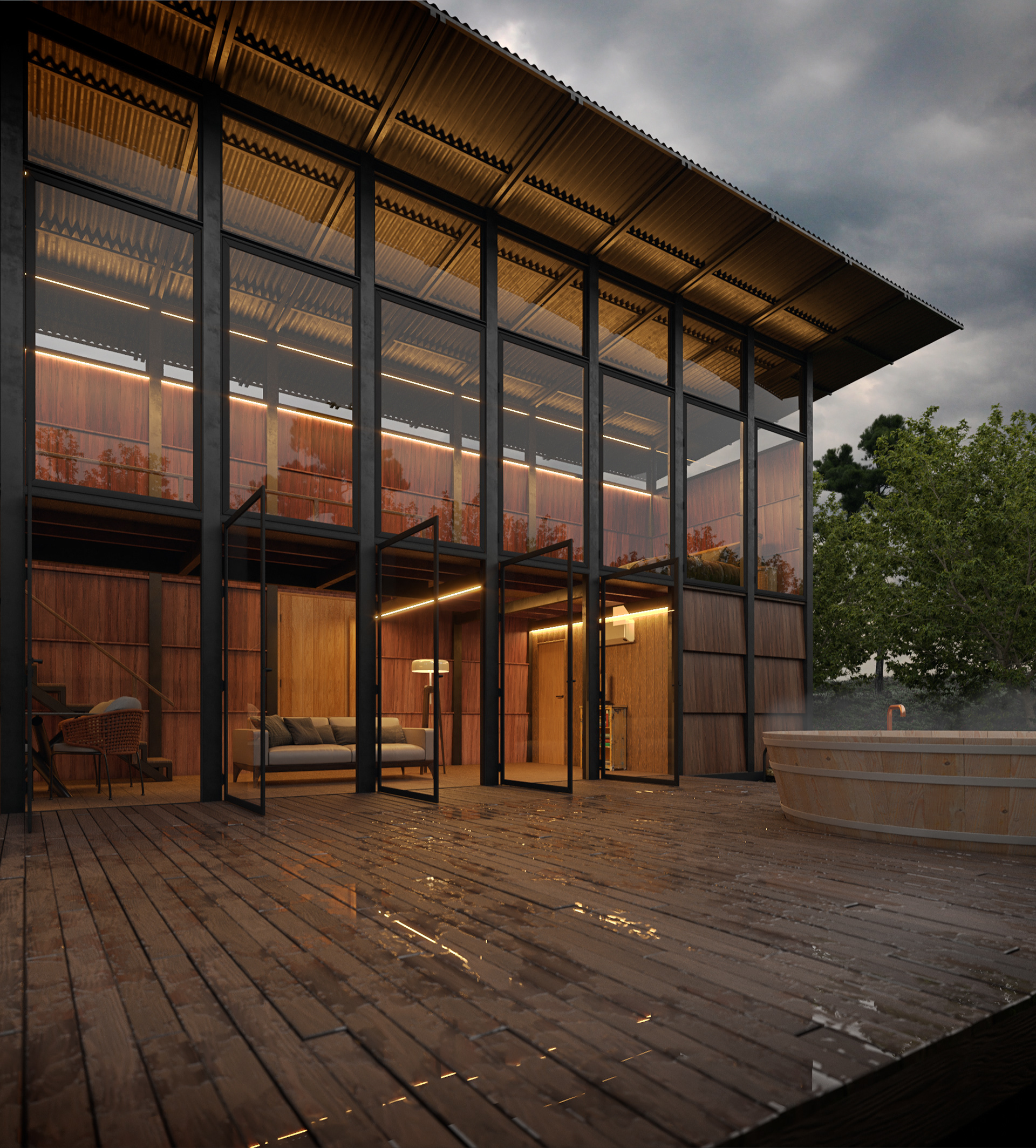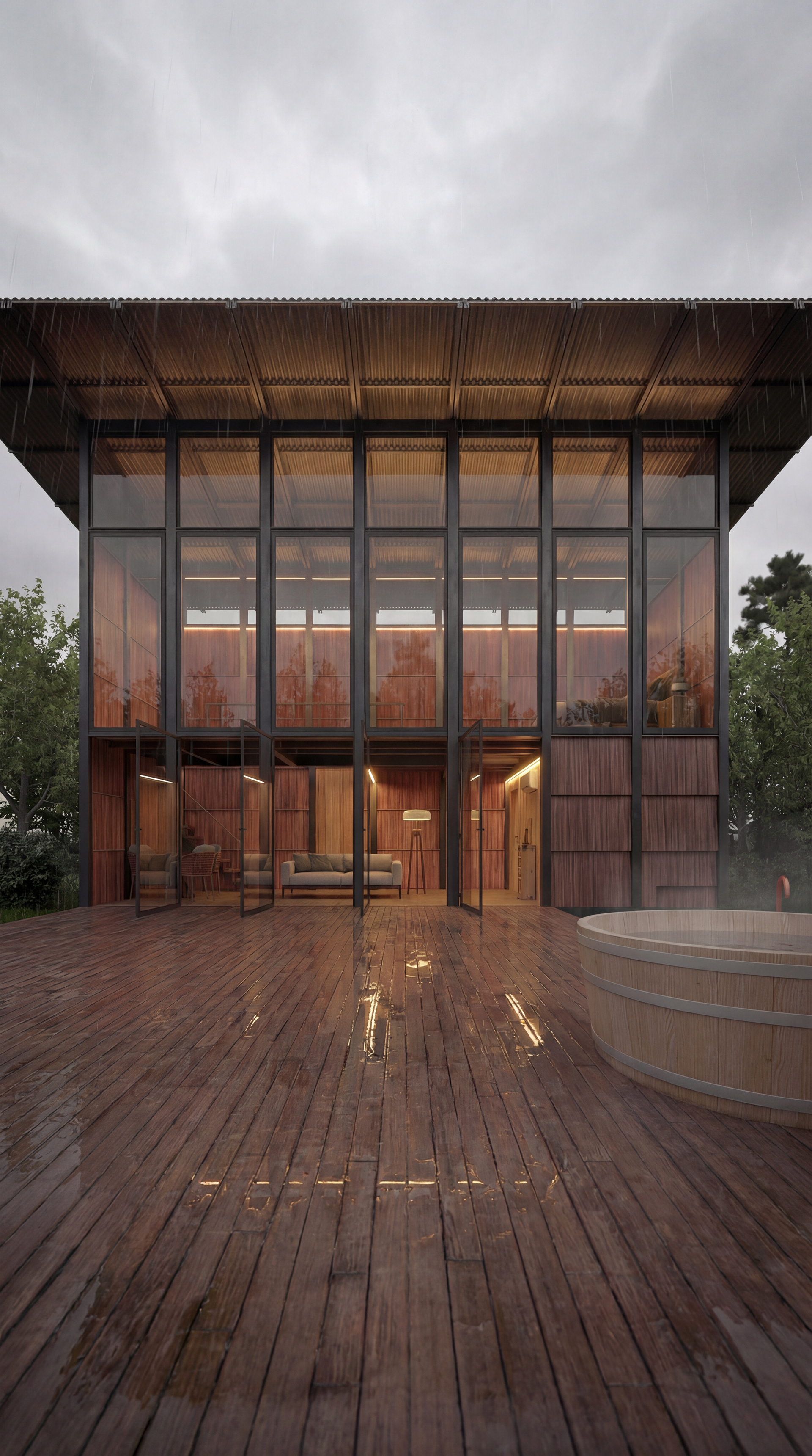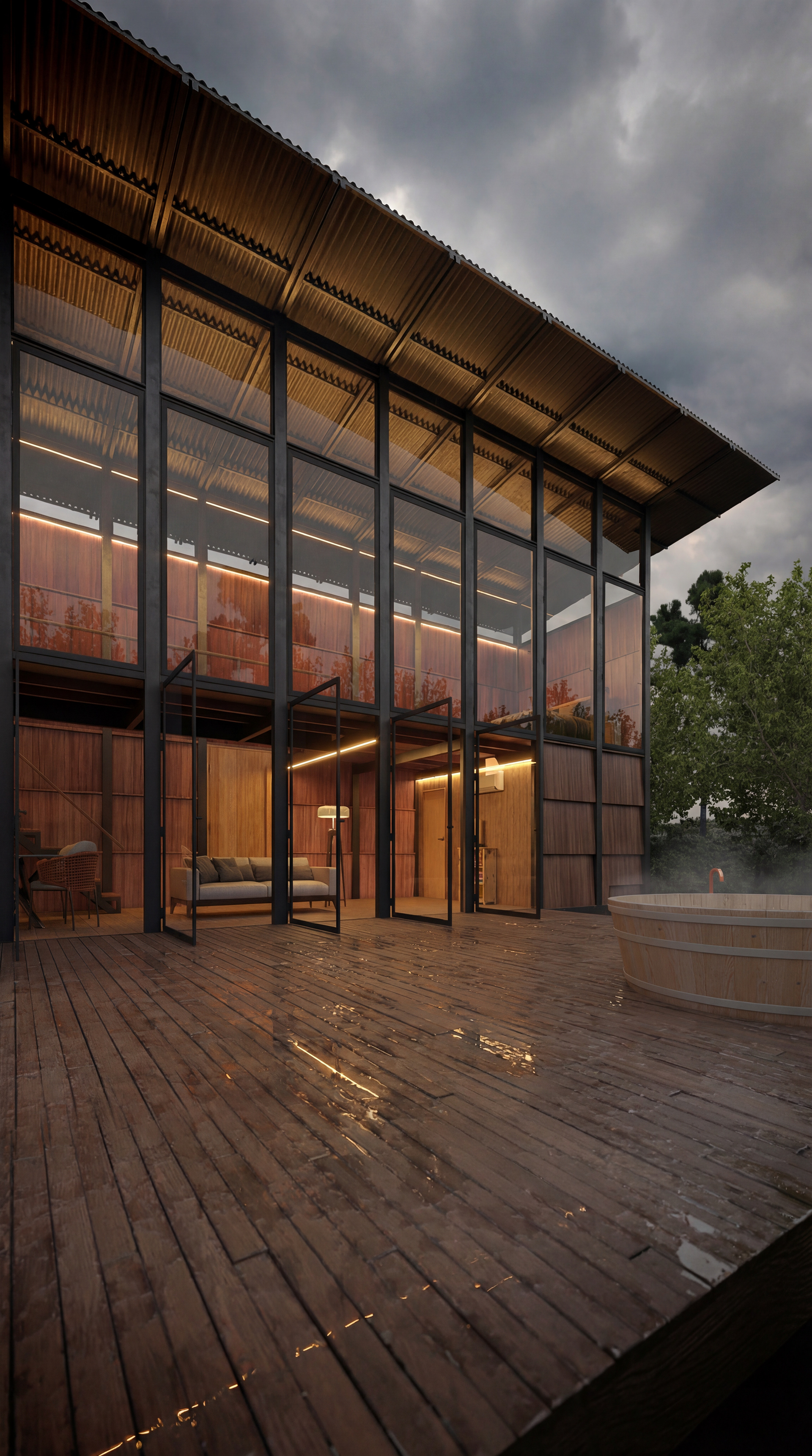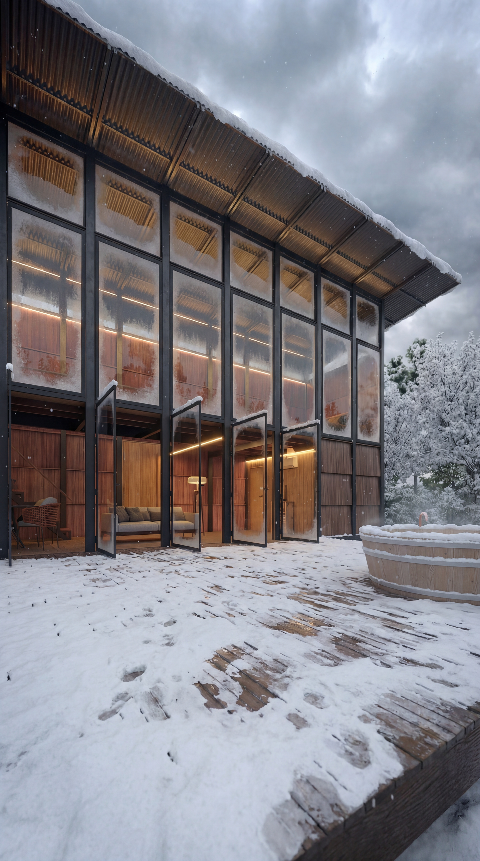 Mais do que uma representação fotorrealista, este projeto do Studio BeRender é um estudo sobre atmosfera. Exploramos como a madeira, o metal e o vidro se comportam sob diferentes condições climáticas. O resultado é uma narrativa imersiva onde o frio do ambiente externo encontra o acolhimento visceral da iluminação interna, criando um refúgio que convida à contemplação absoluta.